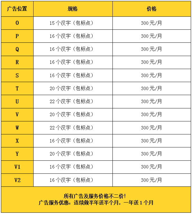 PC端文字广告服务价目表(广告位置请详细对照下面附图标识,如P对P)
