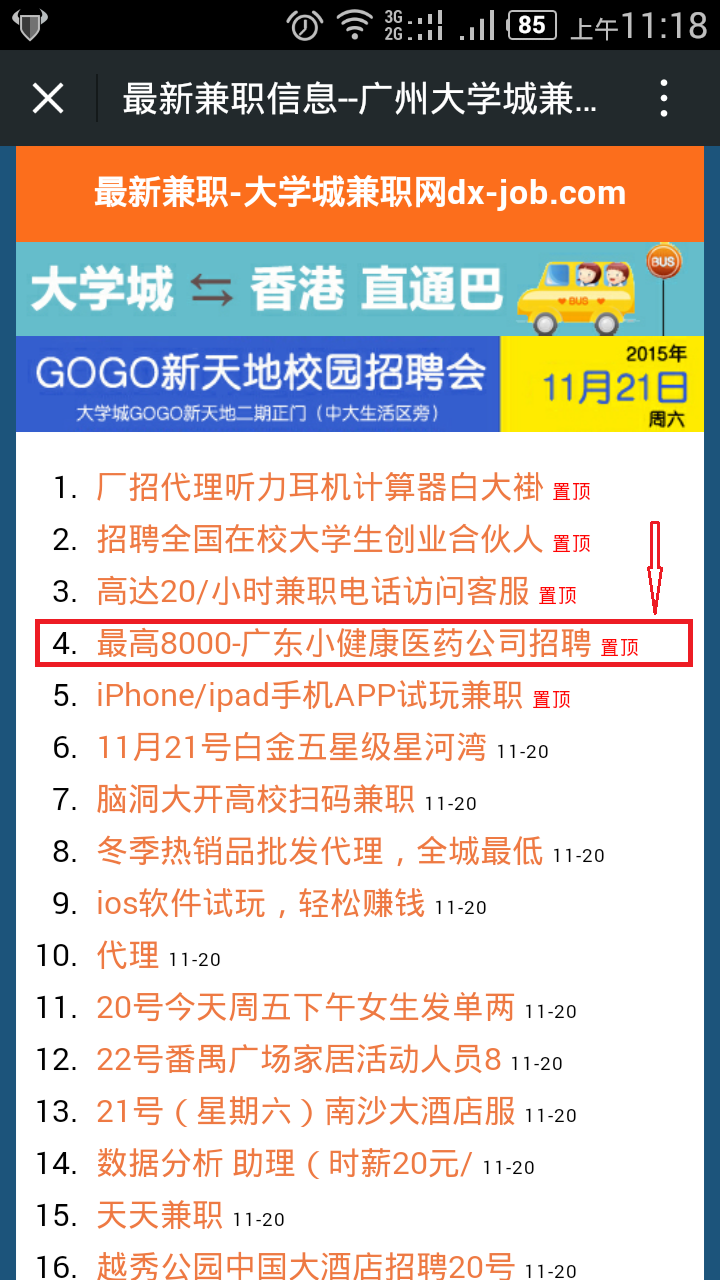 大学城兼职网手机端页面上部文字广告位置如下图,规格:16个字符(包标点),价格:300元/月。