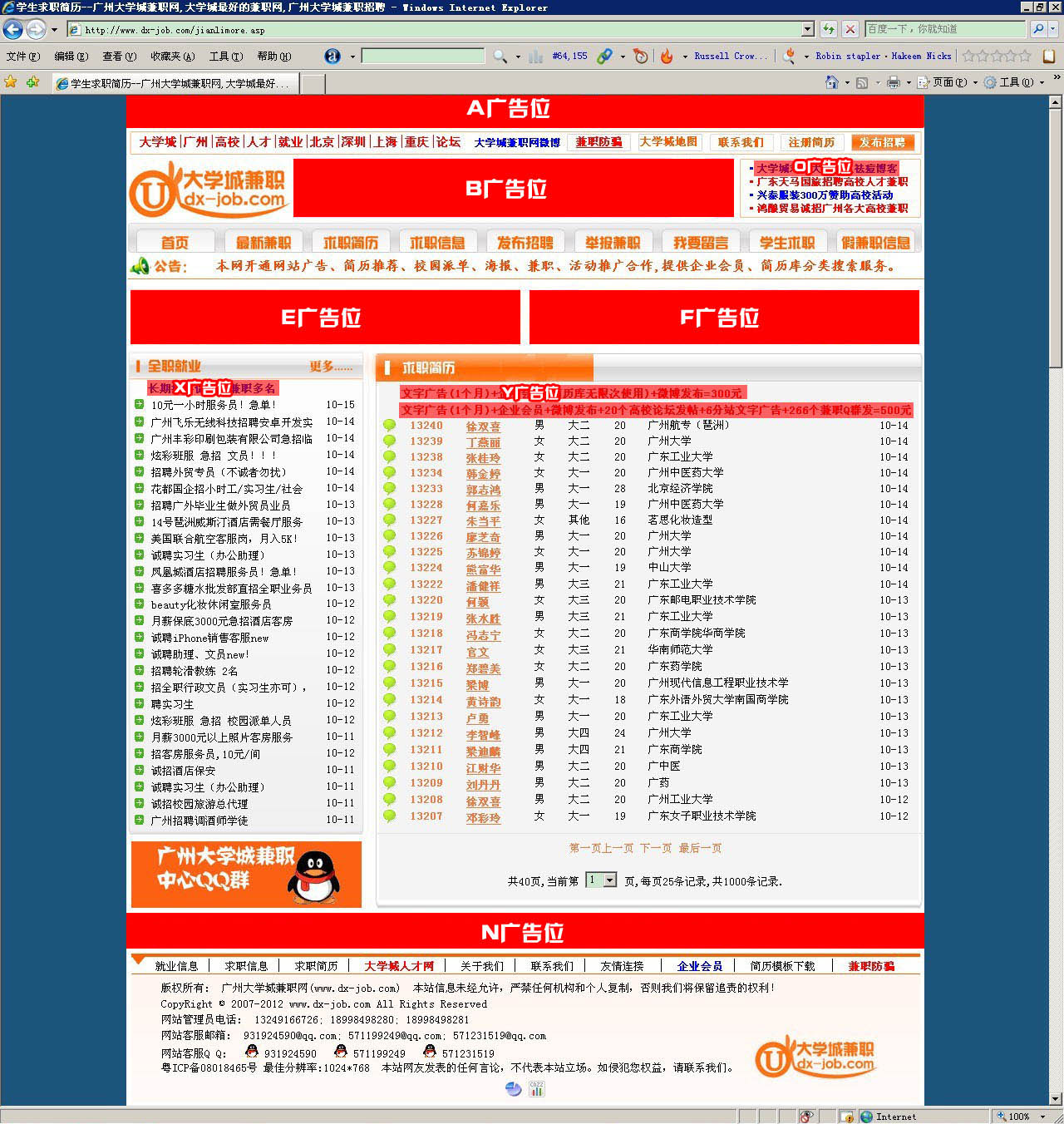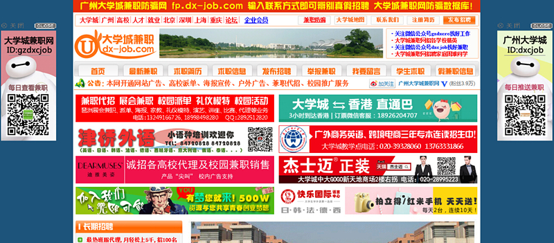 大学城兼职网首页,内页均有文字广告展示(全站展示),推荐理由:大学城兼职网:www.dx-job.com 平均每日12万点击量,最高多达26万点击量,大学城访问量最大的网站,每年多达5千万曝光率,网络传播速度极快,快速有效地在广州高校建立品牌知名度!